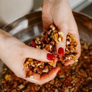 The preparation of our products lasts several days, after which the ingredients maintain their freshness and can be stored for months. The first step is to soak some of the ingredients, like walnuts, almonds, sunflower seeds, and buckwheat. Soaking is essential for several reasons: it helps to remove antinutrients, such as phytic acid, which binds to essential minerals like calcium and zinc, reducing their absorption by the body. Additionally, it eliminates enzyme inhibitors that can hinder digestion and activates minerals and vitamins, making them more easily absorbable. Finally, it helps to eliminate dirt and impurities, ensuring the ingredients are clean. After being soaked overnight, these ingredients are rinsed and then dried using dehydrators at temperatures below 40°C. Regarding the almonds, before being dehydrated, they are peeled with boiling water and then placed in the dehydrator for about 2 nights. After drying (some ingredients require up to two nights), the ingredients are ready to be weighed. The weighing process is highly precise because if the dosage is incorrect, the ingredients cannot provide their benefits. The right combination of ingredients ensures exceptional nutritional value. Once prepared, all the ingredients are carefully packaged into bags.