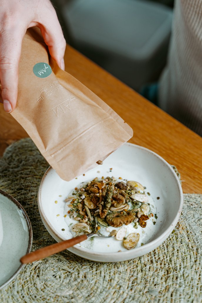 Honey / Bee pollen / Sunflower seeds / Almonds / Raisins / Hemp seeds / Turmeric / Buckwheat / Spirulina / Millet / Walnuts / Flax seeds / Cinnamon / Cardamom